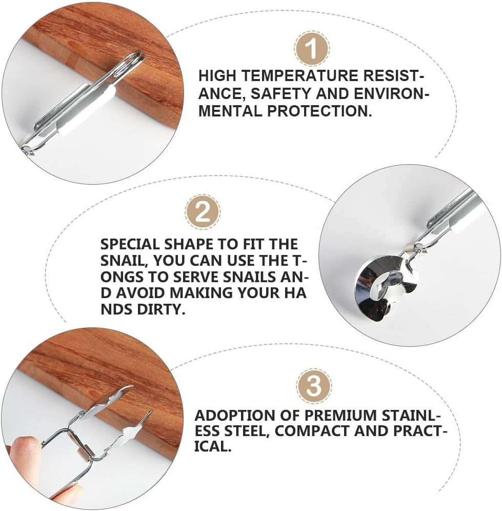Features:-Kitchen food tong kitchen utensil is designed with a special shape suitable for snails, use pliers to hold the snails to avoid getting your hands dirty. for holding clams, snails or other small shellfish!-The snail tongs escargot serving tongs can also be used as daily kitchen utensils such as tea tongs, ice cubes, candy tongs, etc. They are also your right-hand assistant when tasting tea, coffee, and red wine!-Stainless steel snail tongs is designed with high-quality stainless steel materials, and the sturdy materials will improve your long-term service! Easy to clean and can be used for a long time!-Our escargot snail tongs stainless steel is easy to use, the clamp can be opened by retracting the handle, making it easy to use and convenient for you to pick up snails! No need to worry about it falling off!Specifications:- Size: 16. 00X5. 00X4. 00cm/ 6. 29X1. 97X1. 57in.- Color: Silver.- Material: Stainless Steel.Package Including:4 x Escargot Tongs Stainless Steel Cooking Tongs