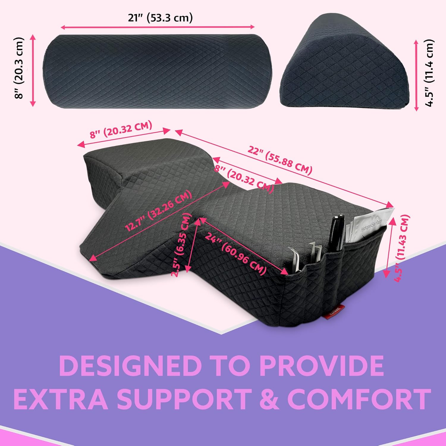 Introducing our exclusive Eyelash Extension Comfort Bundle, meticulously designed to elevate the client experience in beauty treatments, particularly during lengthy eyelash extension procedures. This premium bundle combines two essential salon items: an ergonomic eyelash pillow and a supportive leg pillow, both crafted with an orthopedic design that ensures optimal comfort and physiological support. The eyelash pillow, with its unique curved shape, is tailored to cradle the client's head, aligning the cervical and dorsal spine to the perfect position. This alignment not only enhances comfort but also aids lash artists in their intricate work. The leg pillow complements this by reducing strain on the lower back and legs, a boon during extended sessions. Both pillows are constructed from medium-density memory foam, striking the perfect balance between softness and support. Durability and quality are at the forefront of this bundle. The pillows are encased in a luxurious three-layer airy knitted fabric, with a top layer of 100% cotton for a gentle touch, a middle layer of 100% polyester for enduring use, and a blended bottom layer for added strength. The design also incorporates practicality; the eyelash pillow features convenient pockets on both sides, allowing easy access to essential tools, enhancing the efficiency of the lash artist. Versatility is a key aspect of this bundle. While the leg pillow is an invaluable asset in the salon, it also serves as an excellent addition to home or office settings, providing lumbar support or functioning as a comfortable leg rest. Its ability to improve blood circulation and prevent discomfort makes it a multipurpose tool for everyday use. This bundle not only prioritizes client comfort but also contributes significantly to a positive beauty service experience. Clients who feel relaxed and valued are more likely to enjoy the process and become repeat customers. The combination of ergonomic design, premium materials, and thoug