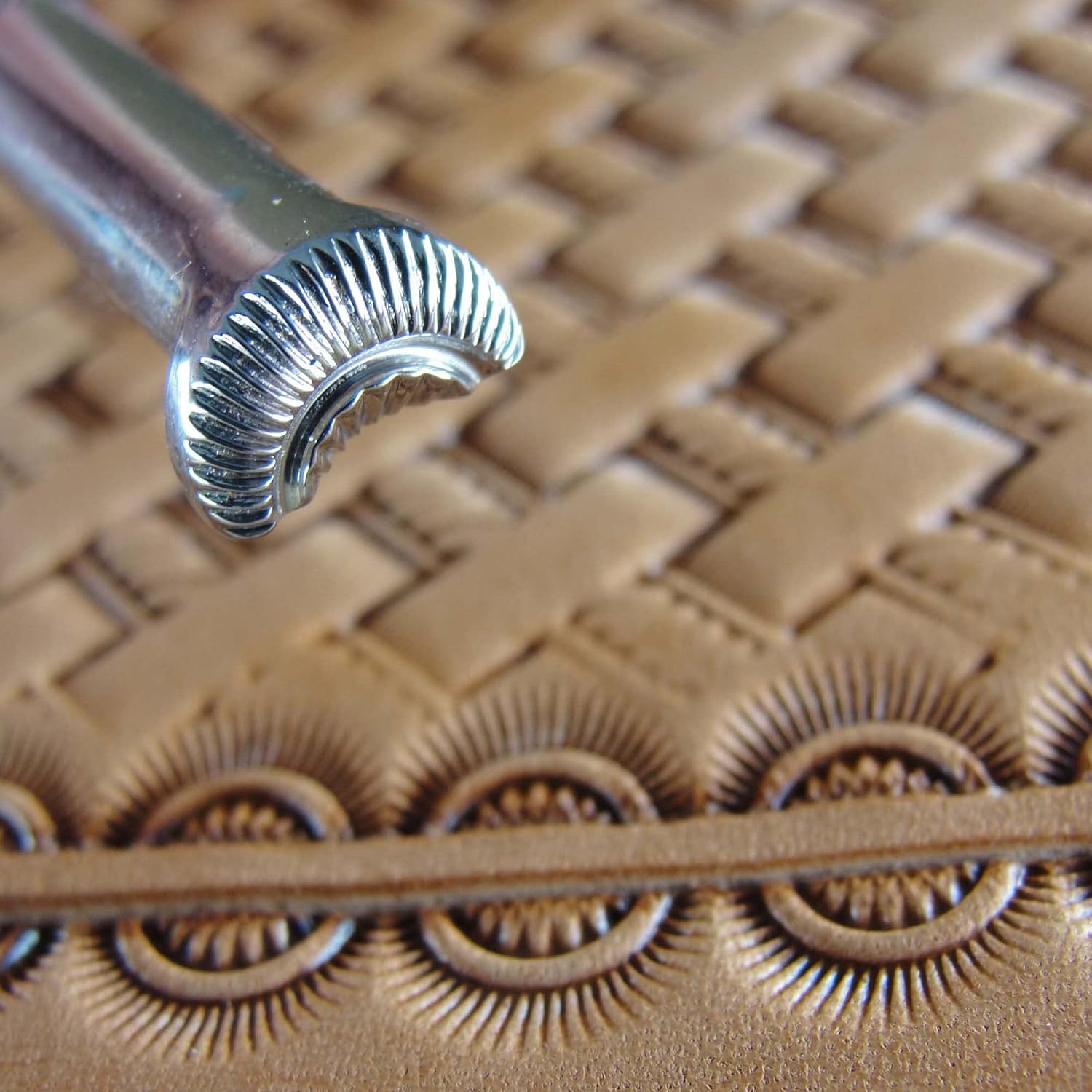 This is a #4 Crescent Border Stamp. It is a great stamp for creating an interesting border and it produces a great pattern. The impression of this stamp measures 3/8" in width and 1/4" in height. If you want to make your work have a little different look, this would be a great stamp to add to your collection.Barry King Tools have gained a reputation for making quality tools for the serious leather craftsman. Barry is a master leather stamper, so he knows how a tool should be made and you can see that in each of his tools. Using only stainless steel in the making of these tools, you will see the precision grinding in every impression you make. If you have been wanting to take your leather carving to the next level, investing in stamps made by Barry King is a great first step.